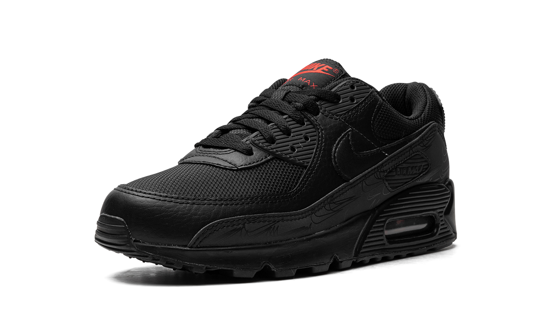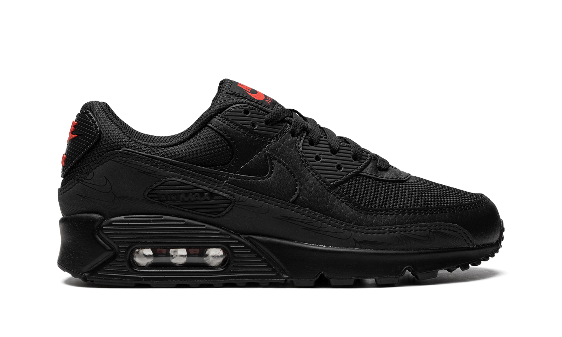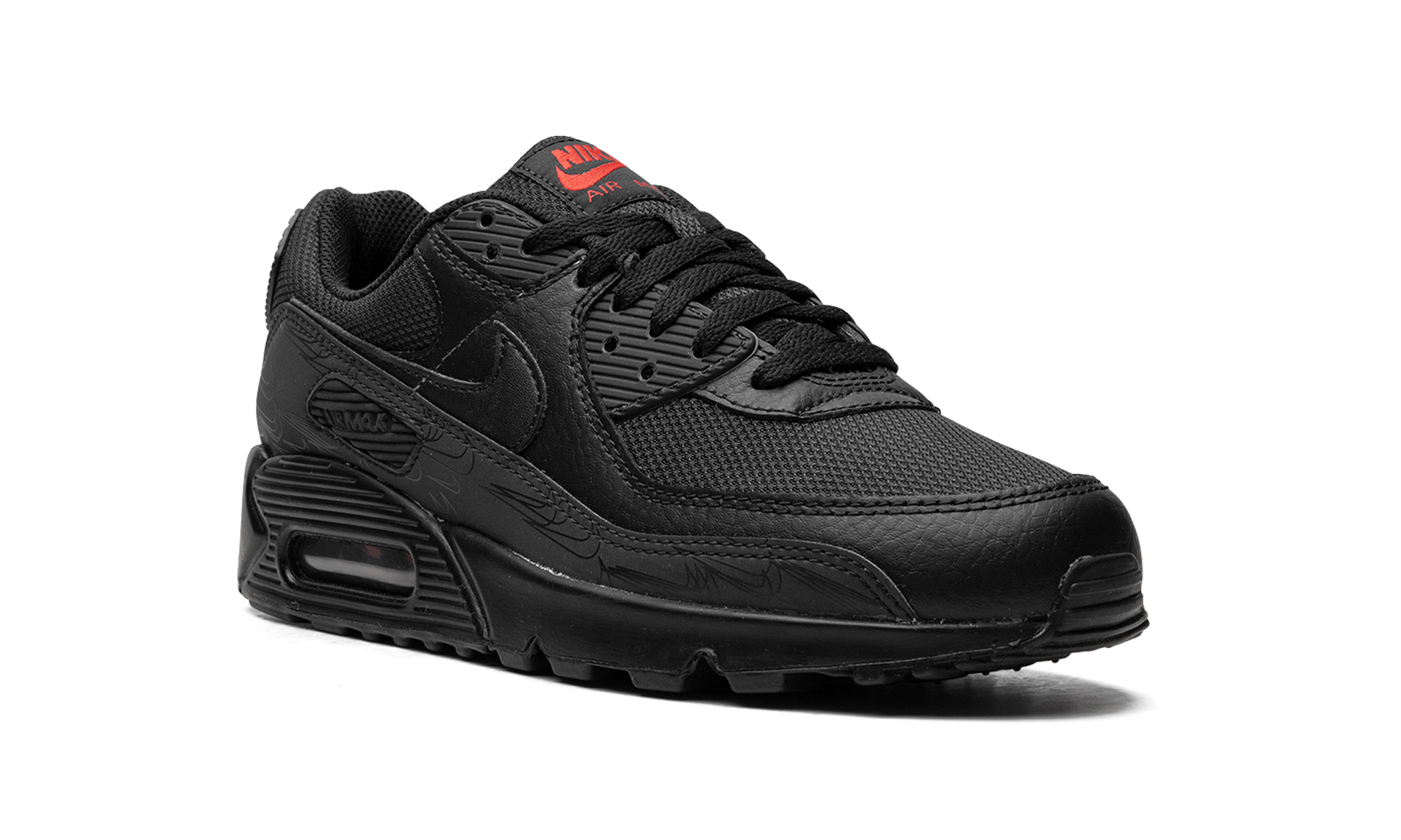 The Nike Air Max 90 "Black Reflective" is a unique colorway of the retro sneaker with a monochromatic black appearance that changes color when exposed to light in the dark. On the surface, the Air Max 90 “Black Reflective” looks like an all-black shoe, but in actuality, the colorway shifts color with the aid of a flash or light. Out of the box, the shoe has a black mesh construction with tonal smooth and tumbled leather overlays throughout the design. The shoe’s hidden detail is seen on the mudguard, which reveals a print of multiple Swooshes when exposed to light in the dark. Fiery red branding elements include “Nike Air” detailing on the heel and “Nike Air Max” insignia on the tongue tag. Black Reflective
