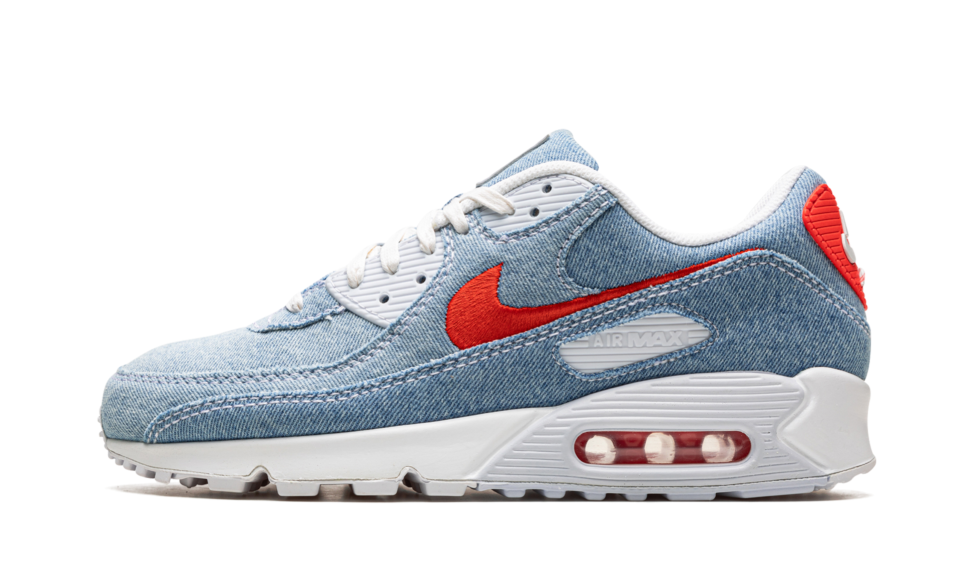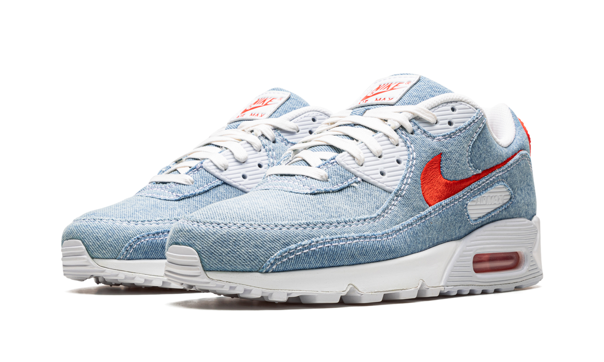 The Nike Air Max 90 “Light Wash Denim” is a colorway of the retro running shoe that features a light wash denim construction. Perfect for any season, the Air Max 90 in the “Light Wash Denim” makeup does away with the mesh-and-leather appearance of the shoe’s original design in favor of a predominantly denim build, and the results are favorable. The upper features light wash denim throughout, including on the toe, mid-panel, heel, and mudguard. A fiery Habanero Red Swoosh is embroidered on the sides, and a red heel counter with “Nike Air” branding is found on the back of the shoe. Additional branding elements include a white “Air Max” logo window on the lateral side of the heel, and red “Nike Air Max” and Swoosh detailing on the tongue tag. The shoe rides on a white foam midsole with a visible Air cushioning unit in the heel. Light Wash Denim