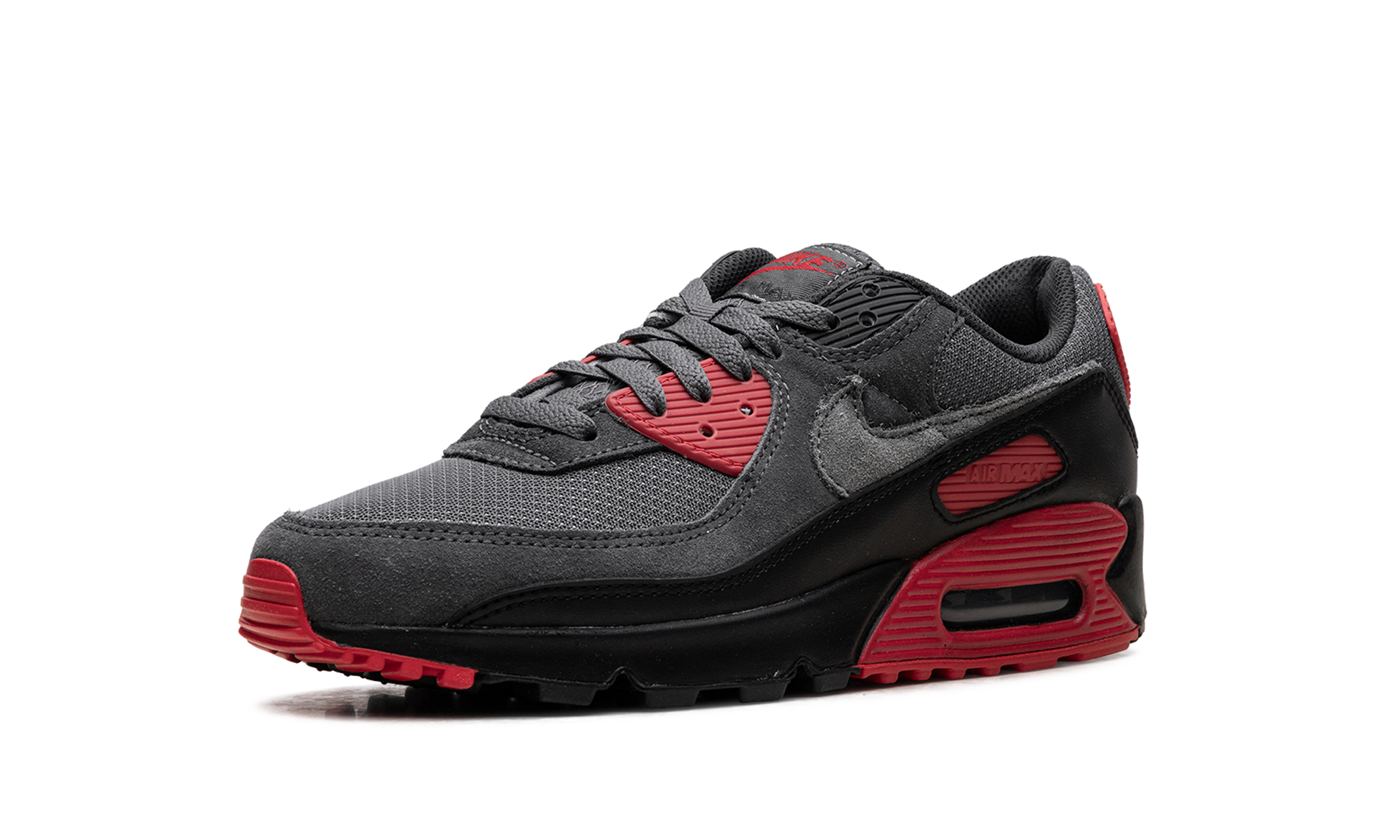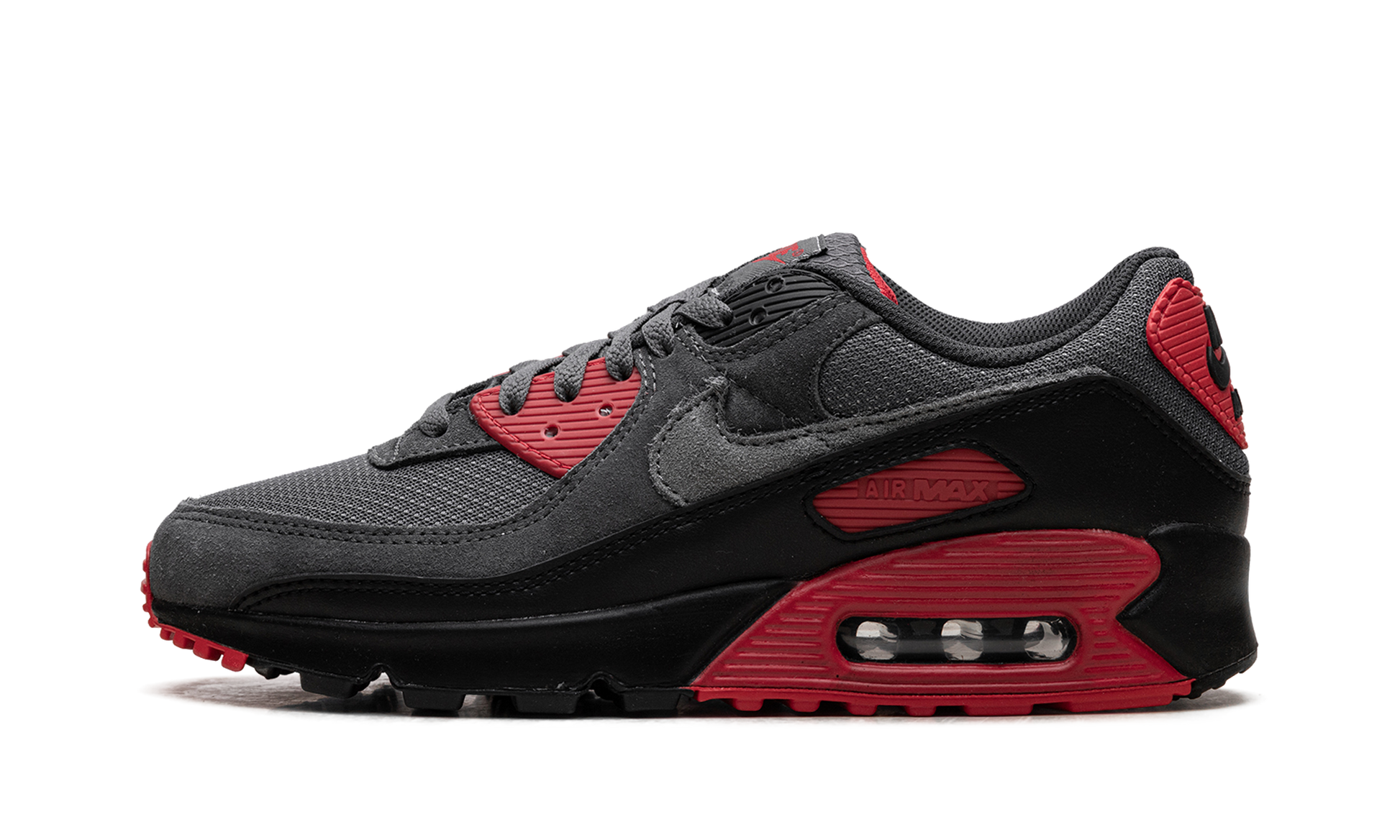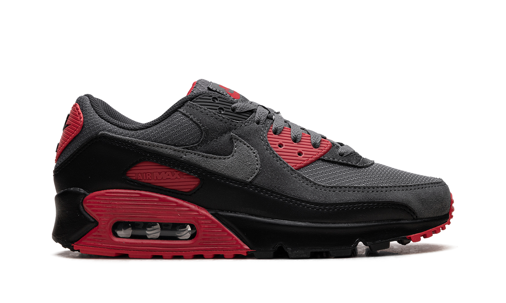 The Nike Air Max 90 is a celebrated icon, and this Black/Iron Grey/Fire Red (DM0029 007) colorway brings a bold, modern edge to its classic '90s running heritage. It combines deep, smoky neutrals with explosive pops of red for a look that's both stealthy and striking. Smoke Grey Fire Red
