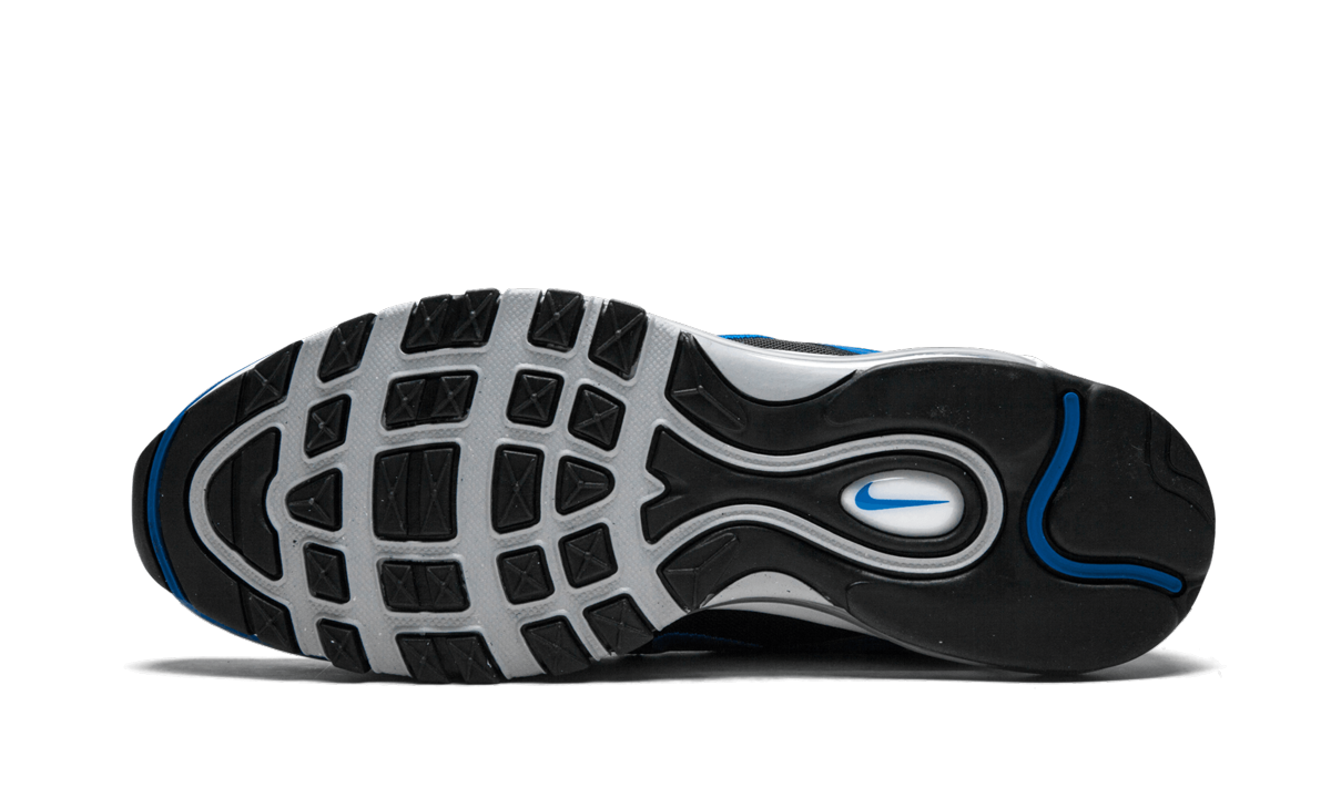 The Nike Air Max 97 has become one of the most popular sneakers on the market since being brought back in a big way in 2017 to celebrate its 20th anniversary. This colorway originally released in 2018. It features a black mesh upper with wavy black overlays. A bright Blue Nebula patent leather wraps the mud guard. The same hue also accentuates the branding on the tongue, heel tab, and side panels. This Nike Air Max 97 sits atop a white midsole and black outsole. Blue Nebula