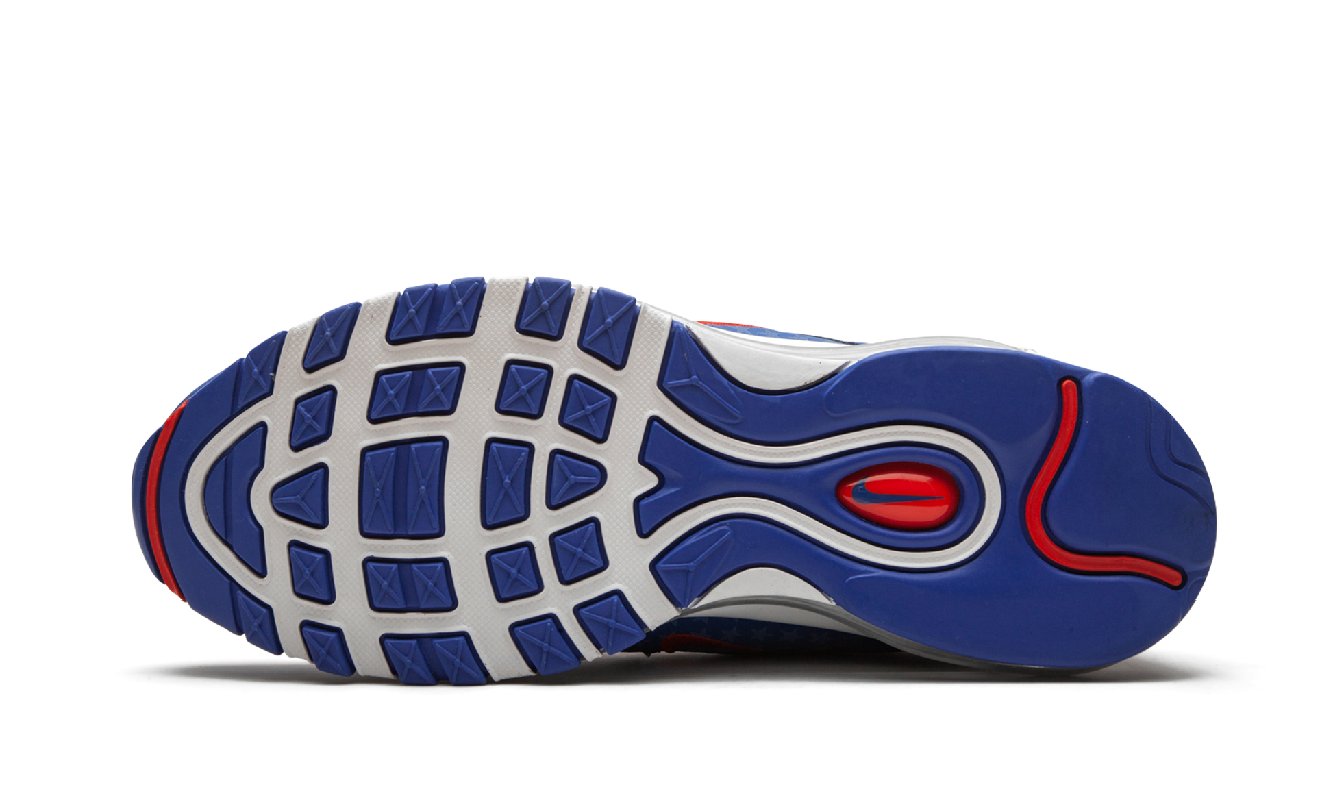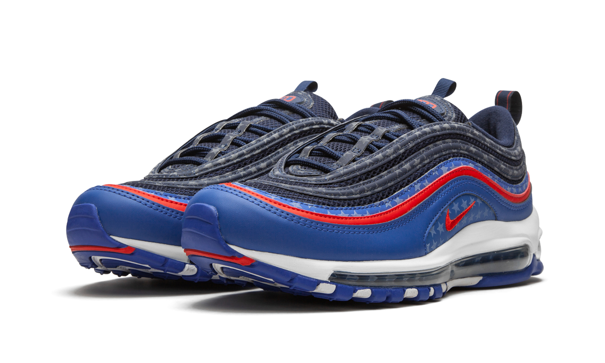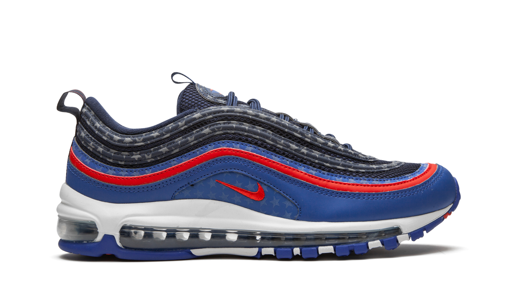 The Nike Air Max 97 "Dallas Away" pays its respects to the city in Texas as part of a "Home and Away" series by the footwear brand. The Air Max 97 features a patriotic red, white and blue color scheme, plus a complementary reflective starry motif. Labeling the tongue is "DDD," a nod to the city's "Triple D" nickname. Underfoot, full-length Max Air provides cushioning, while a red, white, and royal blue sole adds more to the Dallas theme. Other cities that are featured in the "Home and Away" collection are Miami, Houston, and Atlanta. City Pride - Dallas
