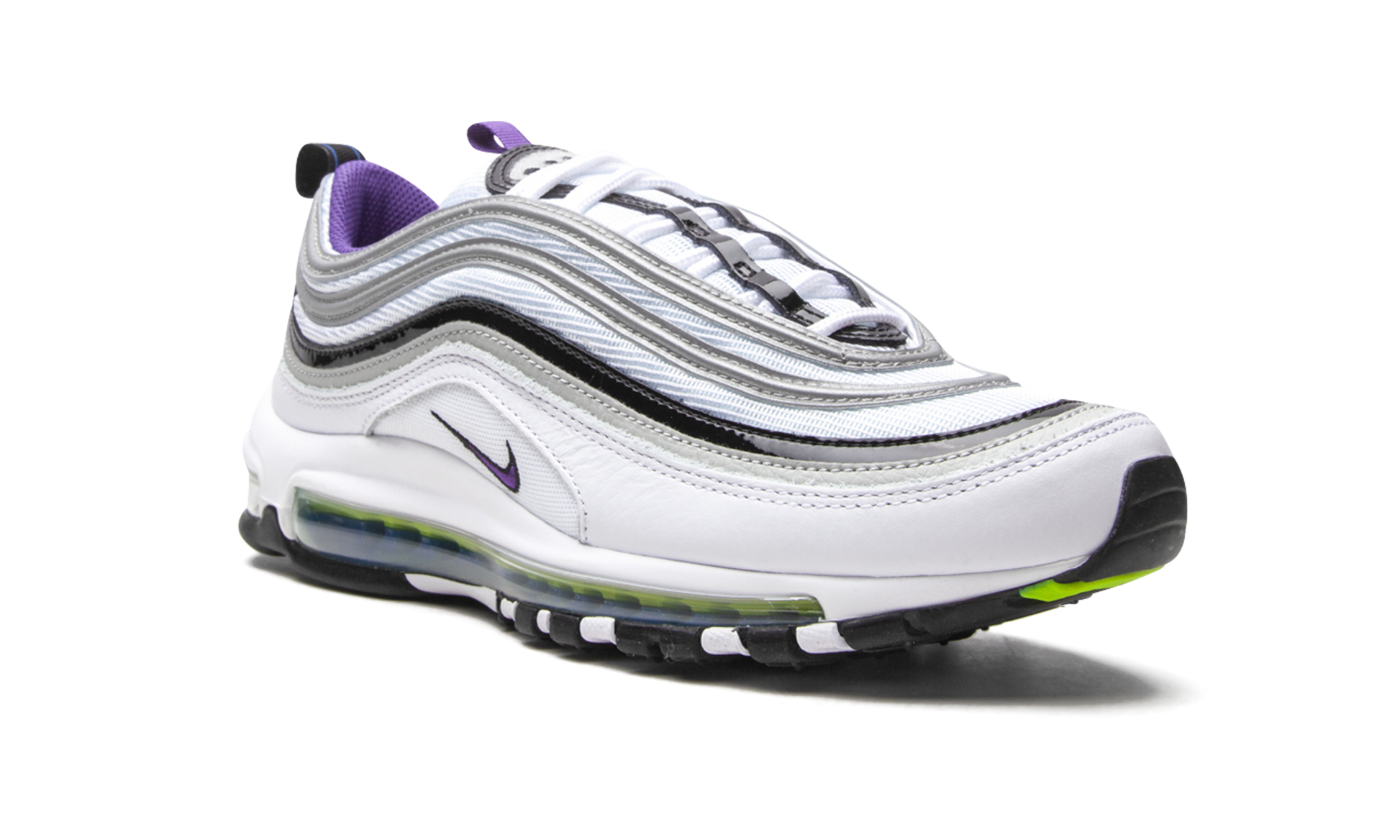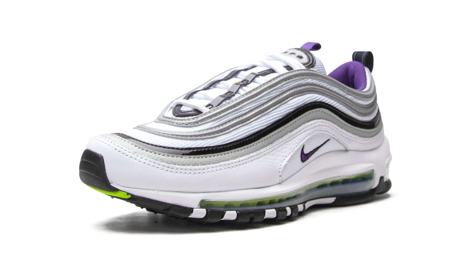 The Nike Air Max 97 “Kaomoji” is a Japanese anime inspired look for classic retro running shoe. Charmingly quirky, the “Kaomoji” dials up the fun on the classic ‘90s silhouette with removable “Kaomoji” patches that can be attached to the tongue. The rest of the design is kept minimalistic with white tumbled leather on the mudguard and white mesh under the wavy black-and-grey leather panels. An embroidered Court Purple Swoosh appears above on the white mesh branding window above the white rubber midsole on either side of the shoe. The regal shade of purple appears on the nylon pull tab on the tongue and on the liner, as well. Volt “Air Max” branding can be found on the black nylon strip on the heel. Anime inspired “nike!” insignia is printed on the insole. A full-length visible Air unit with neon accenting in the midsole provides a responsive ride. Release date: January 19, 2021. Kaomoji