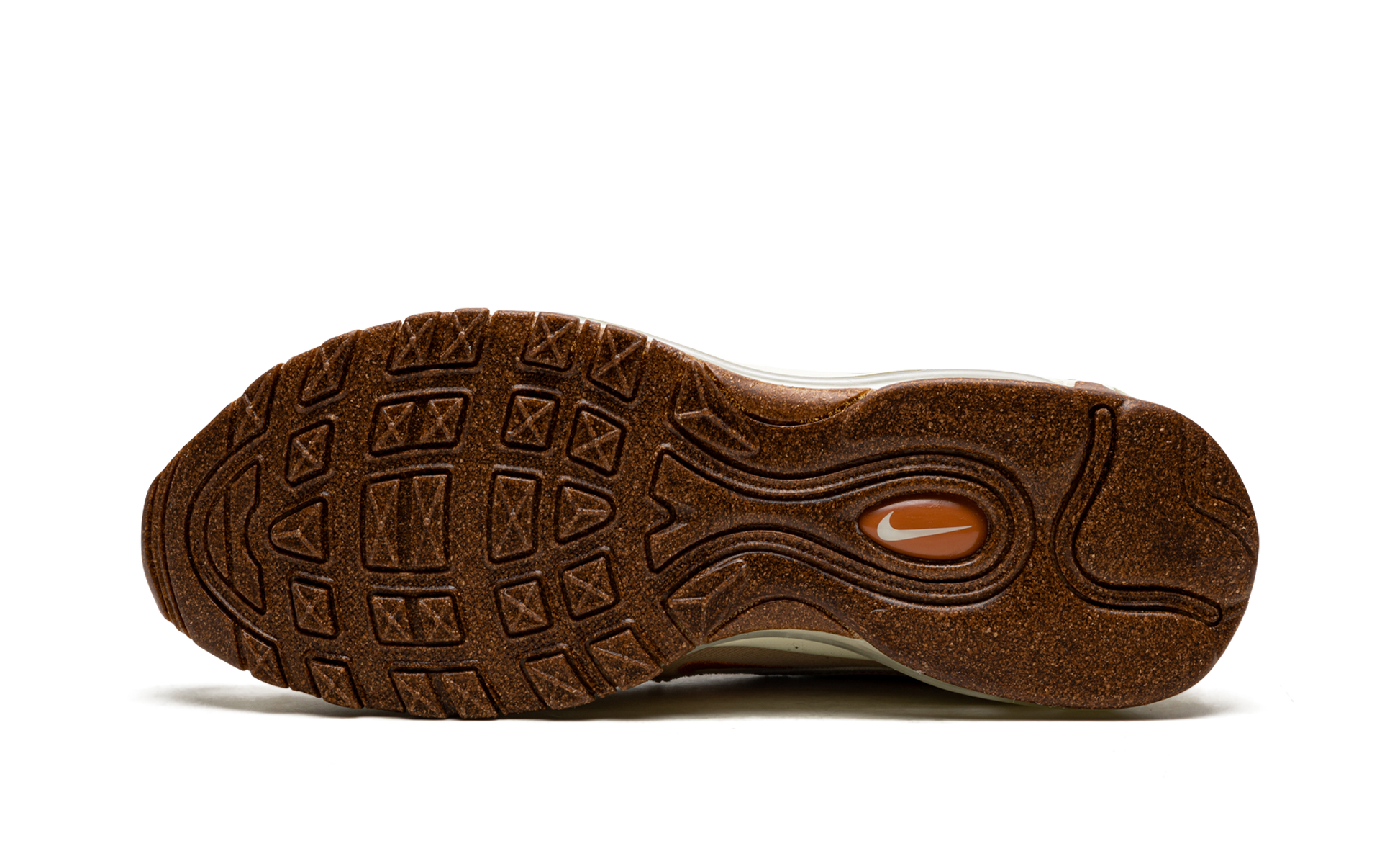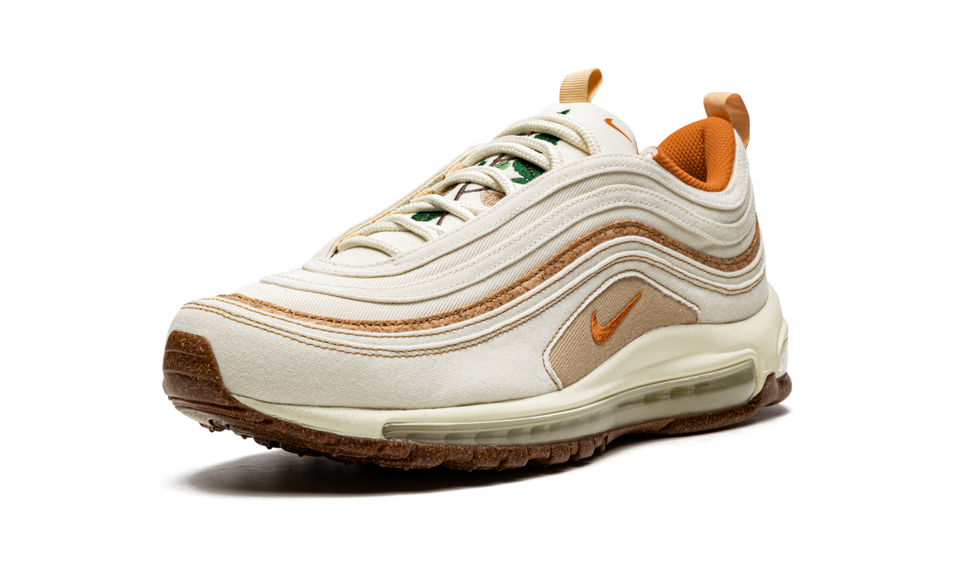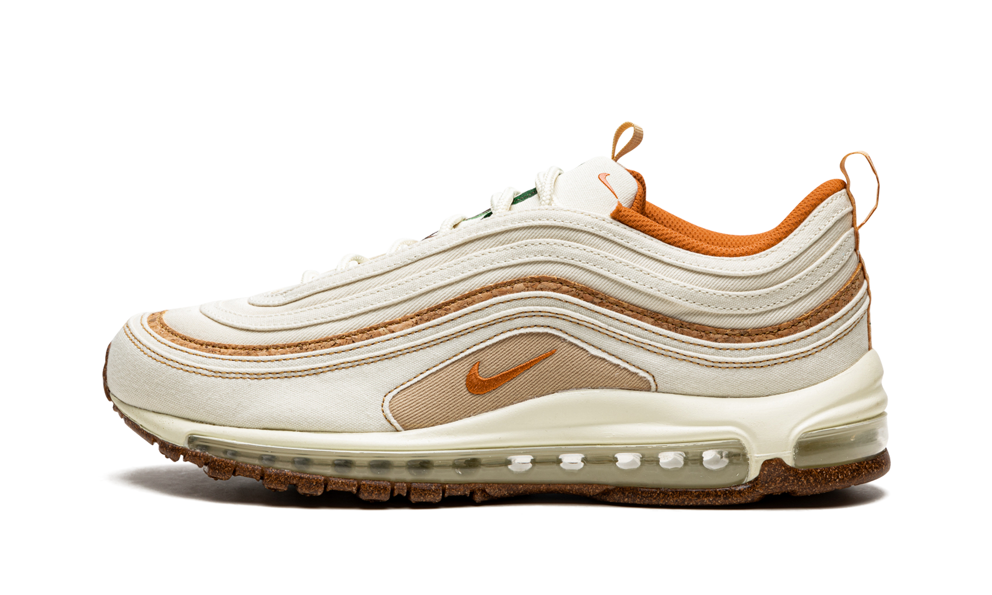 The Nike Air Max 97 SE “Cork” is a colorway of the retro running shoe from Nike’s “Fig 6” line. From Spring 2021, the “Cork” Air Max 97 is a creative look for the popular silhouette, one that incorporates materials such as canvas, mesh, and cork. The shoe features a Coconut Milk-colored canvas mudguard and wavy overlays against a tonal mesh base. A thin strip of cork material is found above the mudguard. An embroidered cork-colored Swoosh is found just above the mudguard. The Air Max 97’s signature full-length visible Max Air cushioning system is embedded in the white foam midsole. A speckled light brown outsole completes the look. Air Max 97 SE