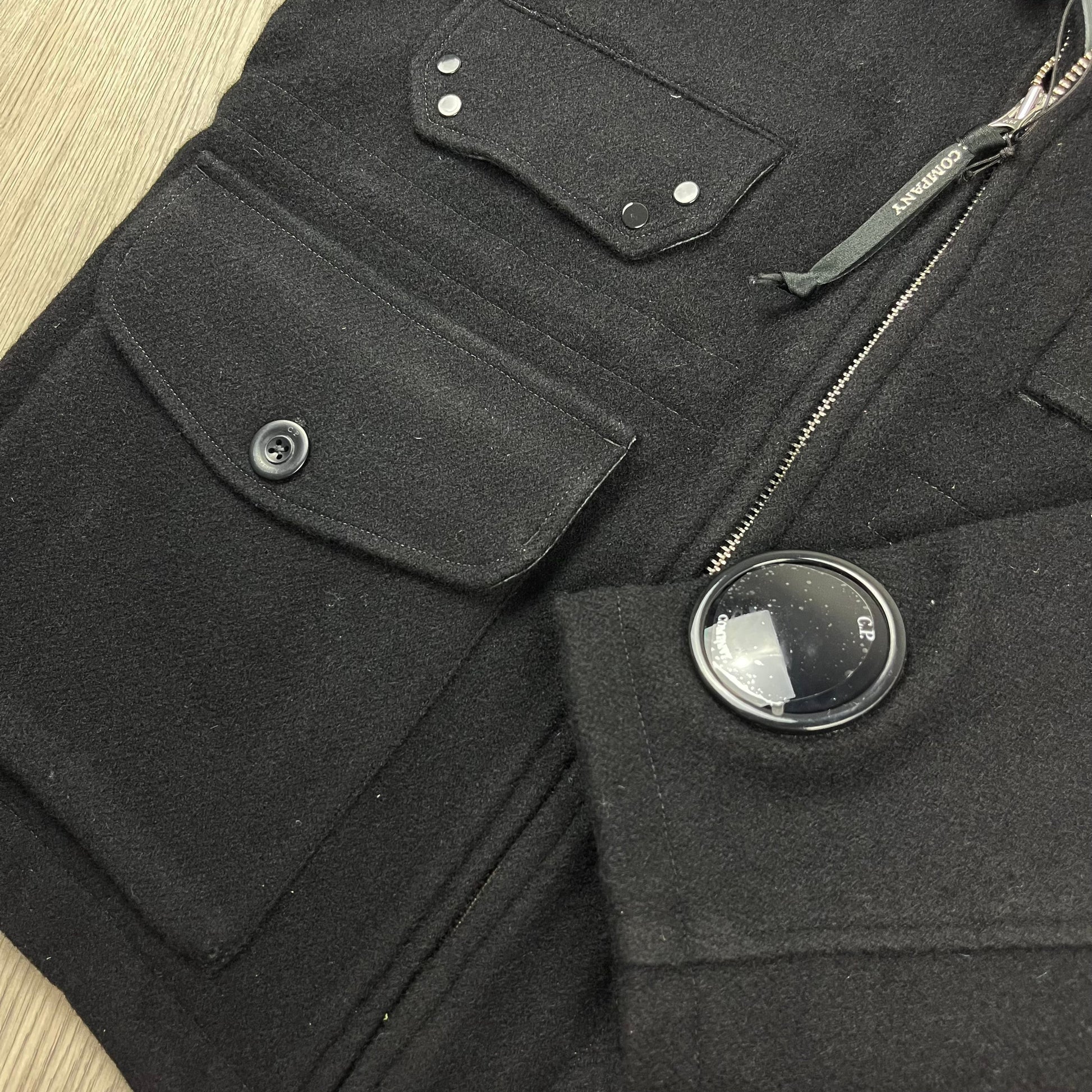 Black CP Company Duffel Jacket with Goggle hood and watch-viewer lens on the cuff
