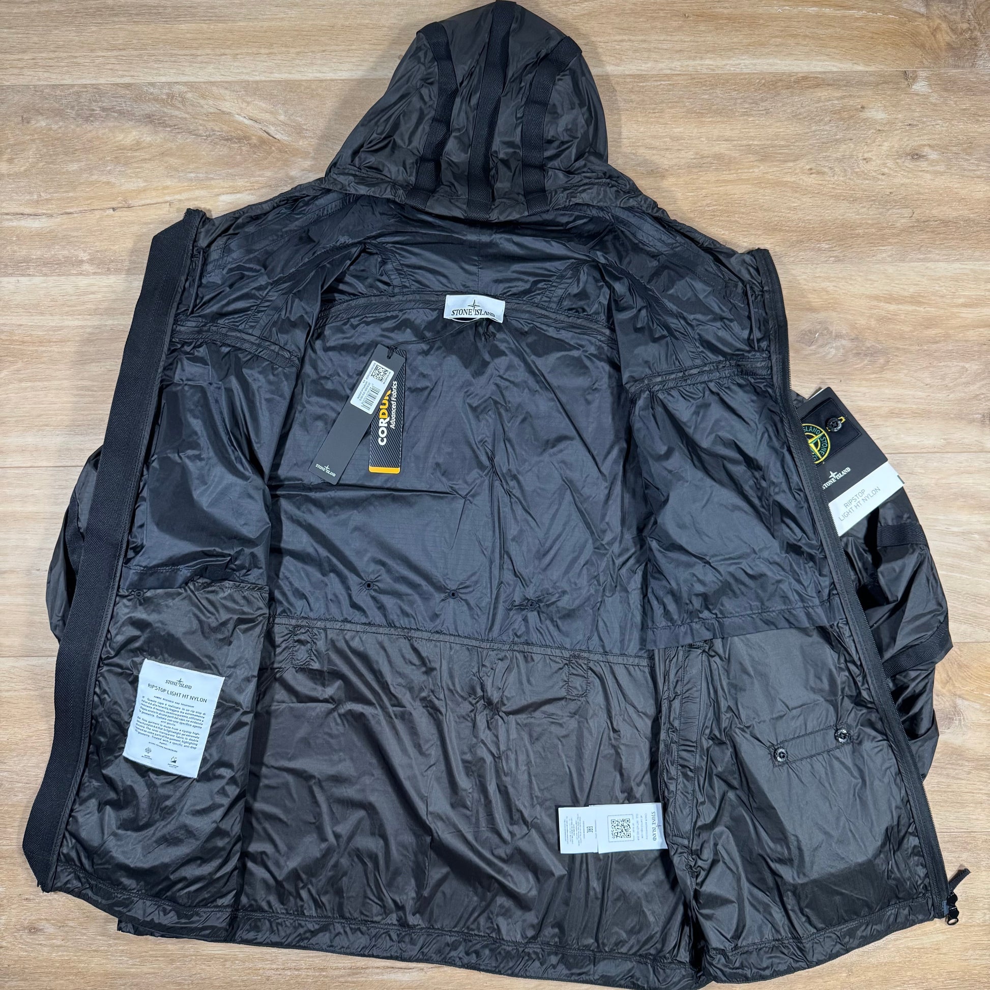 This Stone Island light hooded jacket is crafted from high-tenacity ripstop nylon 6.6, a lightweight yet exceptionally durable fabric. Semi-transparent sections are double layered to highlight the garment’s geometry, while a specific anti-drop treatment adds water resistance. The design features a secured drawstring hood, reflective nylon tape details along the hood, chest, and sleeves, and slanted zip hand pockets with two transparent inner pockets. Additional details include elasticated cuffs, back vents, an inner drawstring at the hem, and the Stone Island badge on the left sleeve. Finished with a two-way zip fastening for versatile wear.
